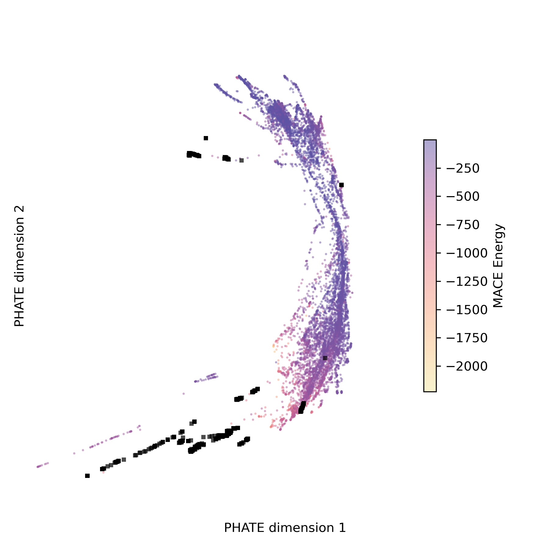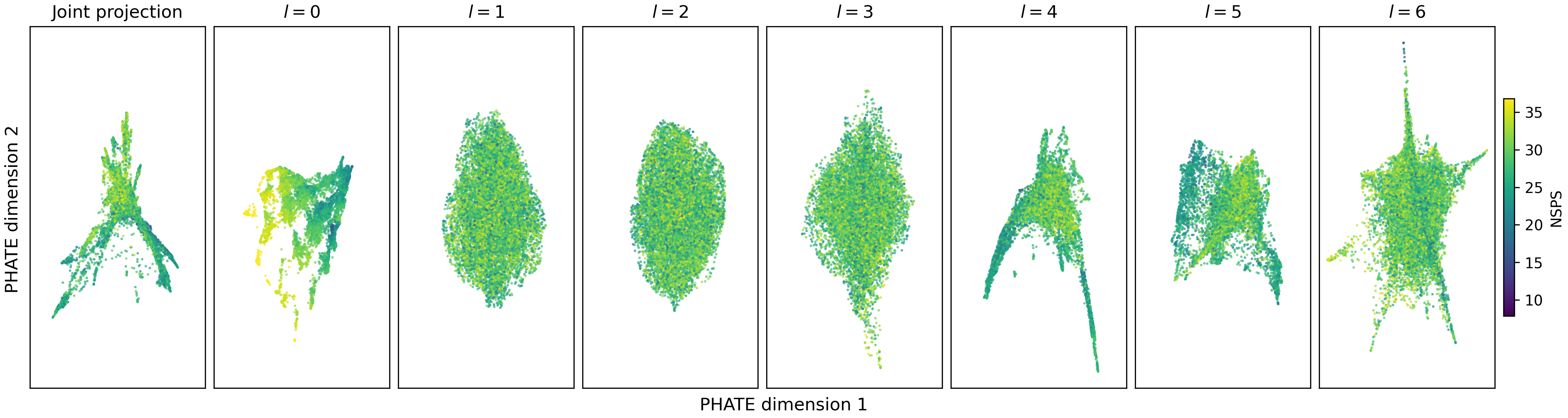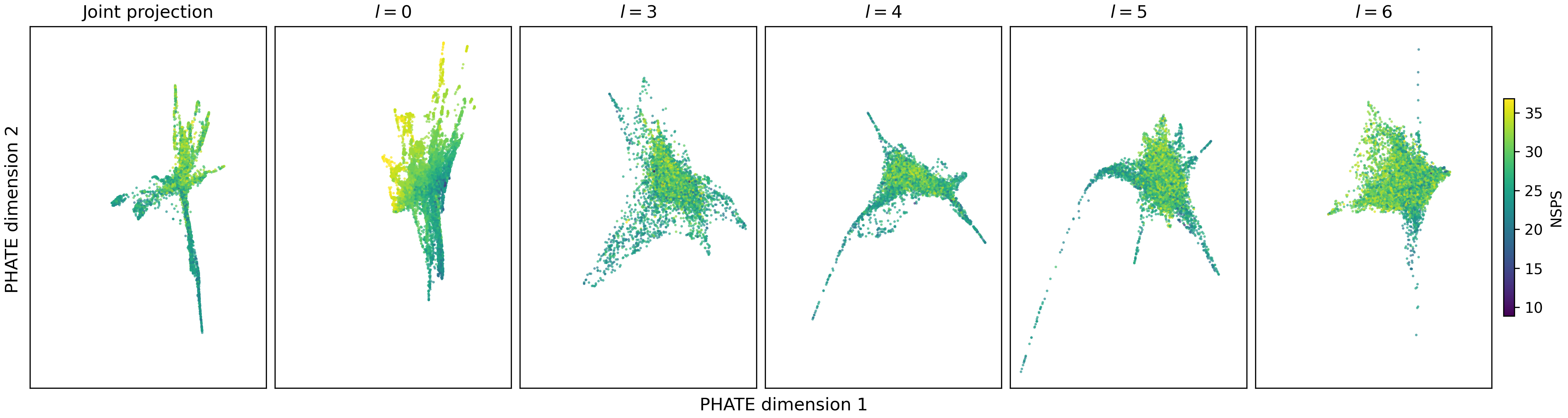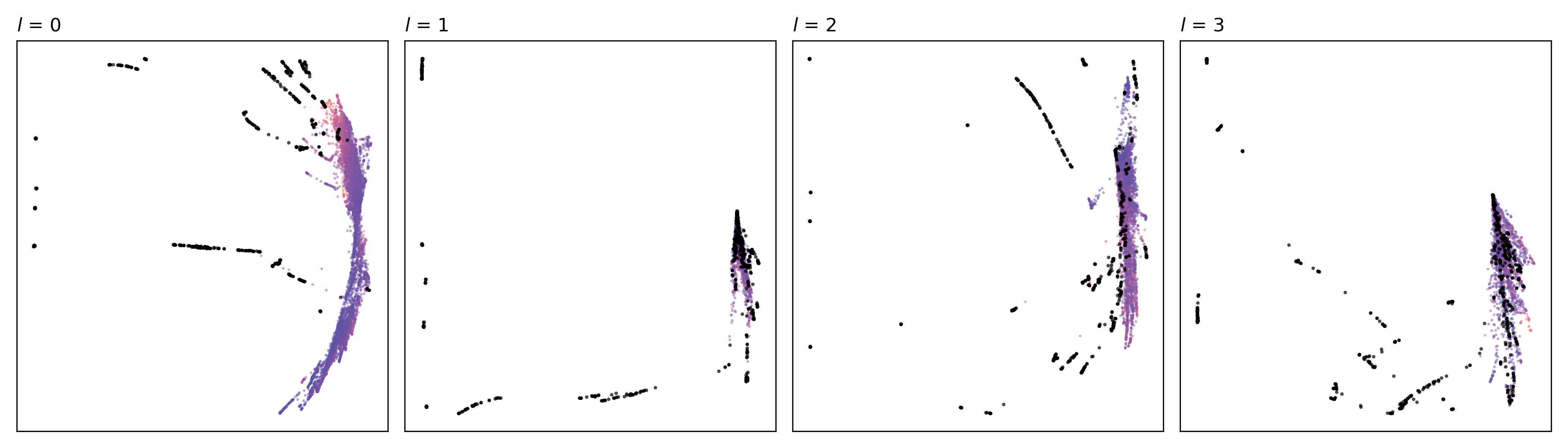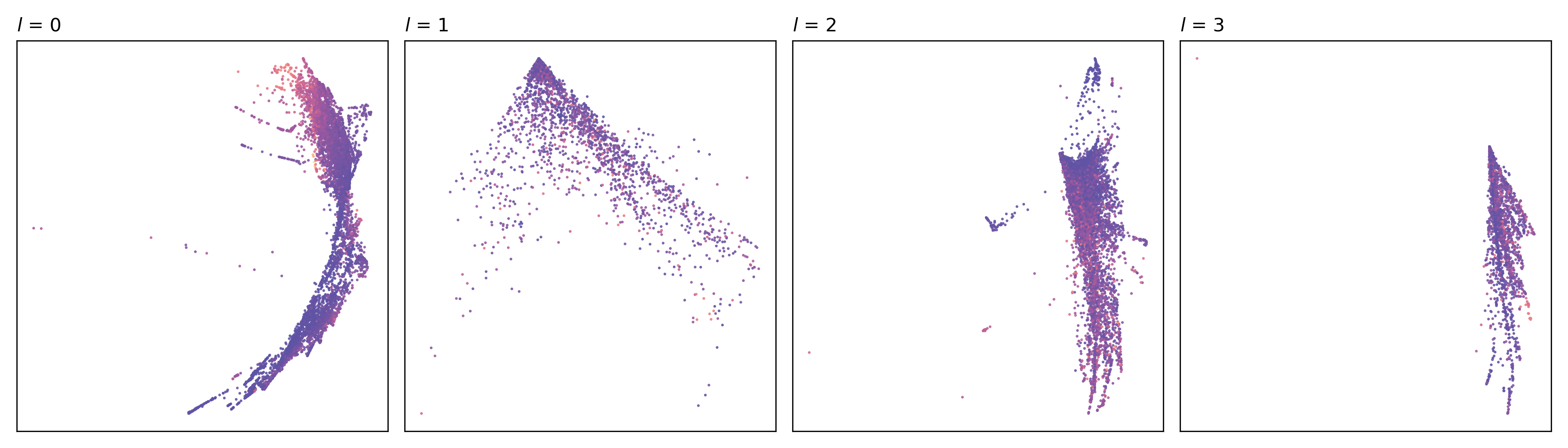 $l=1-3$ latents are largely unstructured and unused—test error 0.73 eV